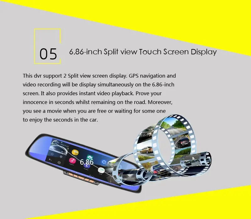este dvr soporte 2 pantalla de visualización de pantalla Dividida. navegación GPS y grabación de vídeo será mostrar simultáneamente en la pantalla de 6.86 pulgadas. sino que también proporciona la reproducción de vídeo instantánea. probar su inocencia en segundos sin dejar de ser en el camino. por otra parte, ves una película cuando usted está libre o esperando a alguien para disfrutar de los segundos en el coche.