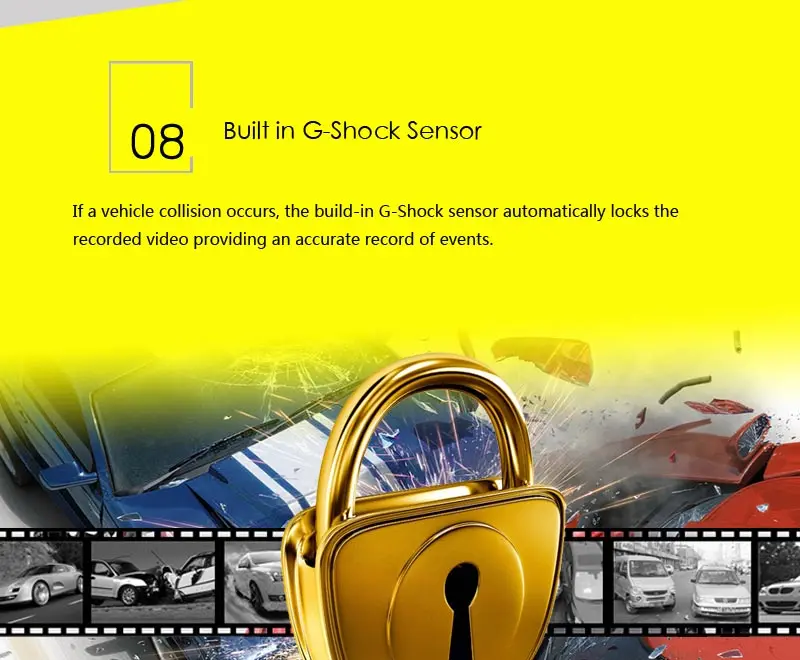 si se produce la colisión de un vehículo, el construir-en el sensor de Choque se bloquea automáticamente el vídeo grabado proporcionar un registro exacto de los acontecimientos.