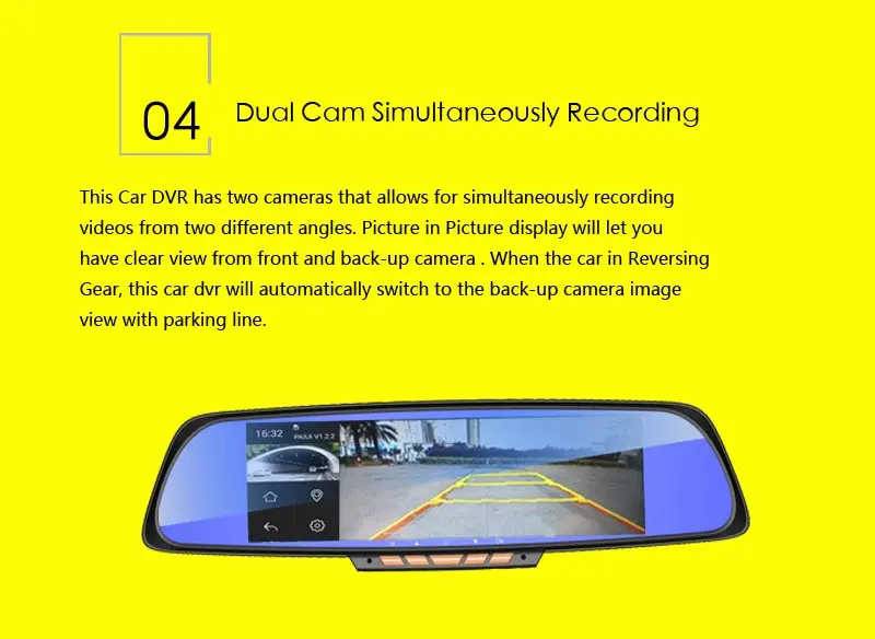 este DVR Coche con dos cámaras que permite grabar vídeos desde dos ángulos diferentes de forma simultánea. imagen en pantalla la Imagen le permitirá tener una visión clara de front y back-up de la cámara. cuando el coche en el Engranaje de Marcha Atrás, este dvr coche cambia automáticamente a la cámara de marcha atrás vista de imagen con la línea de estacionamiento.