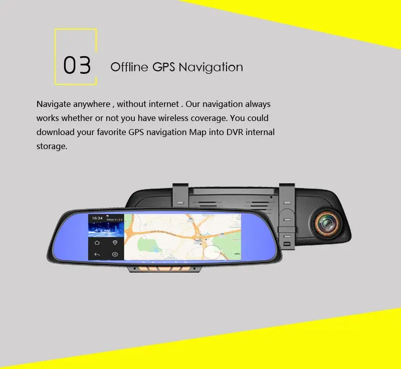 navegar en cualquier lugar, sin internet. nuestra navegación siempre obras o no tienes cobertura inalámbrica. usted puede descargar su favorito de navegación GPS Mapa en DVR de almacenamiento interno.