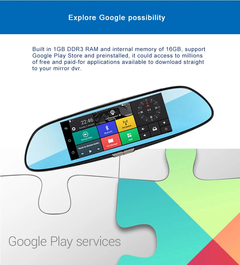 construido en 1 GB DDR3 RAM y memoria interna de 16 GB, apoyo Google Play Store y preinstalado, que podría acceder a millones de envío y de pago para las aplicaciones disponibles para descargar directamente a su espejo dvr.