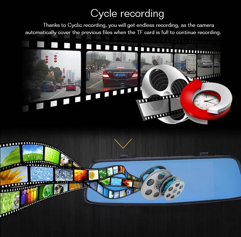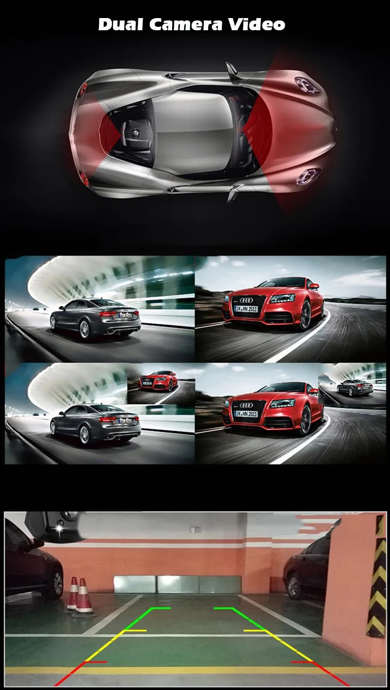 - este DVR Coche con dos cámaras que permite grabar vídeos desde dos ángulos diferentes de forma simultánea. imagen en pantalla la Imagen le permitirá tener una visión clara de front y back-up de la cámara. cuando el coche en el Engranaje de Marcha Atrás, este dvr coche cambia automáticamente a la cámara de marcha atrás vista de imagen con la línea de estacionamiento.