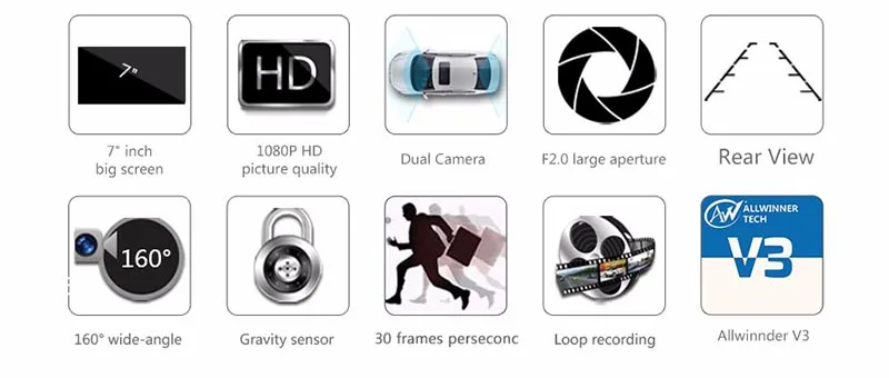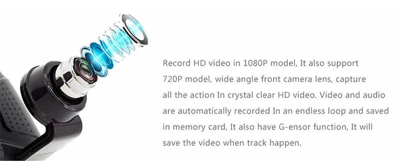 - modo de grabar Vídeo de ALTA DEFINICIÓN en 1080 P. 160 grados de Ángulo Ancho lente de la cámara frontal, capturar toda la acción en calidad de imagen HD de vídeo. de vídeo y de audio se graba automáticamente en un bucle sin fin y se guarda en la tarjeta de memoria. registro de los incidentes de tráfico, el recorrido panorámico momentos inesperados o los medios de comunicación social digno de vídeo.