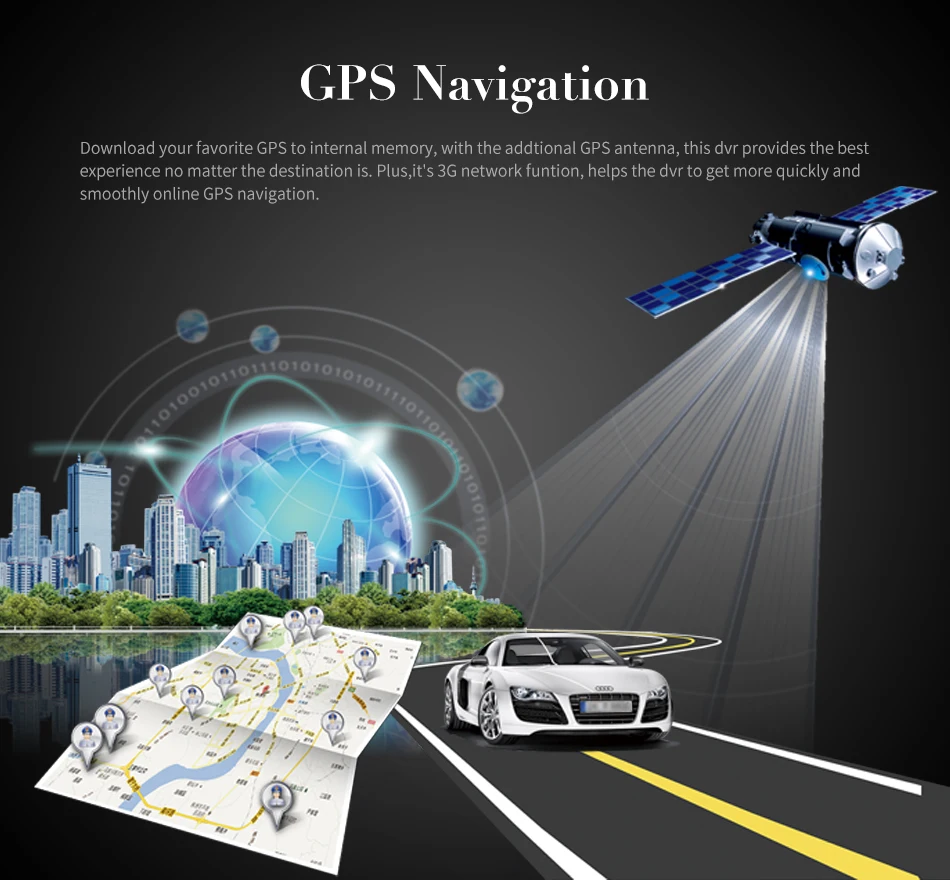 descargar su favorito de GPS en la memoria interna, con el adicional de la antena GPS, este dvr ofrece la mejor experiencia, no importa el destino es. además, es 3G función de red, ayuda a que el dvr para obtener más rápidamente y sin problemas en línea de navegación GPS.