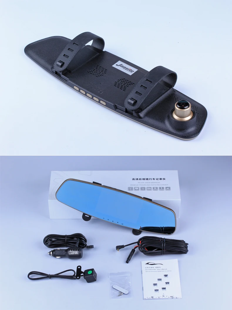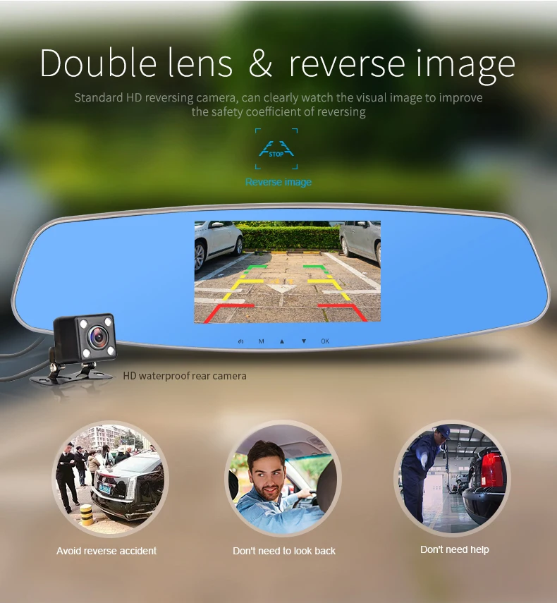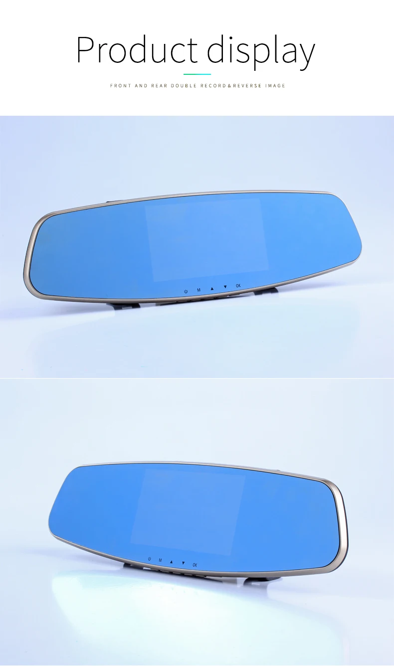 este DVR Coche con dos cámaras que permite grabar vídeos desde dos ángulos diferentes de forma simultánea. imagen en pantalla la Imagen le permitirá tener una visión clara de front y back-up de la cámara. cuando el coche en el Engranaje de Marcha Atrás, este dvr coche cambia automáticamente a la cámara de marcha atrás vista de imagen con la línea de estacionamiento.